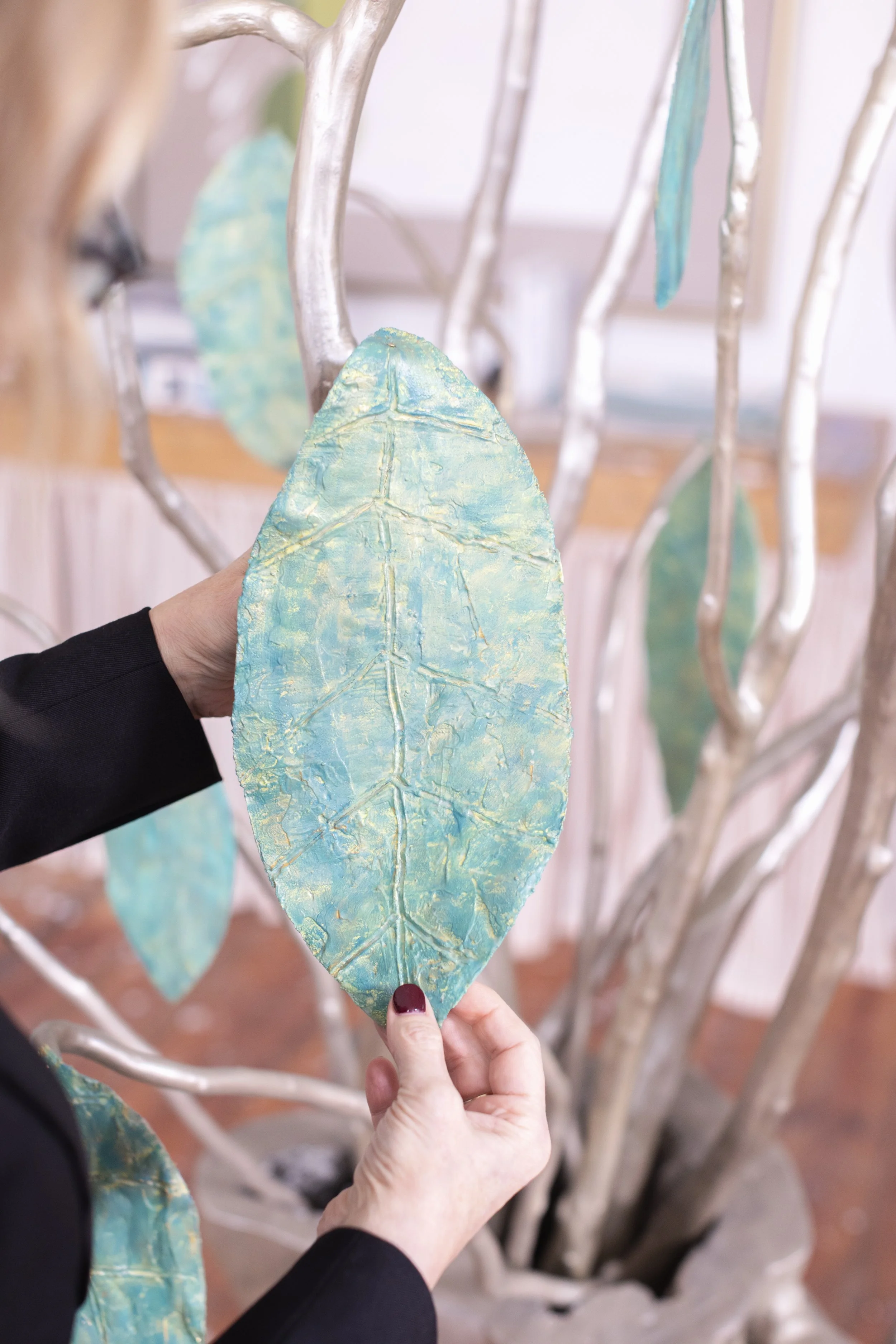 To fit the aesthetic of the Balance Design Team, I decided to mix a small amount of plaster with metallic paint and hand painted layer up layer. I painted the branches in a similar tone and started making the leaves.