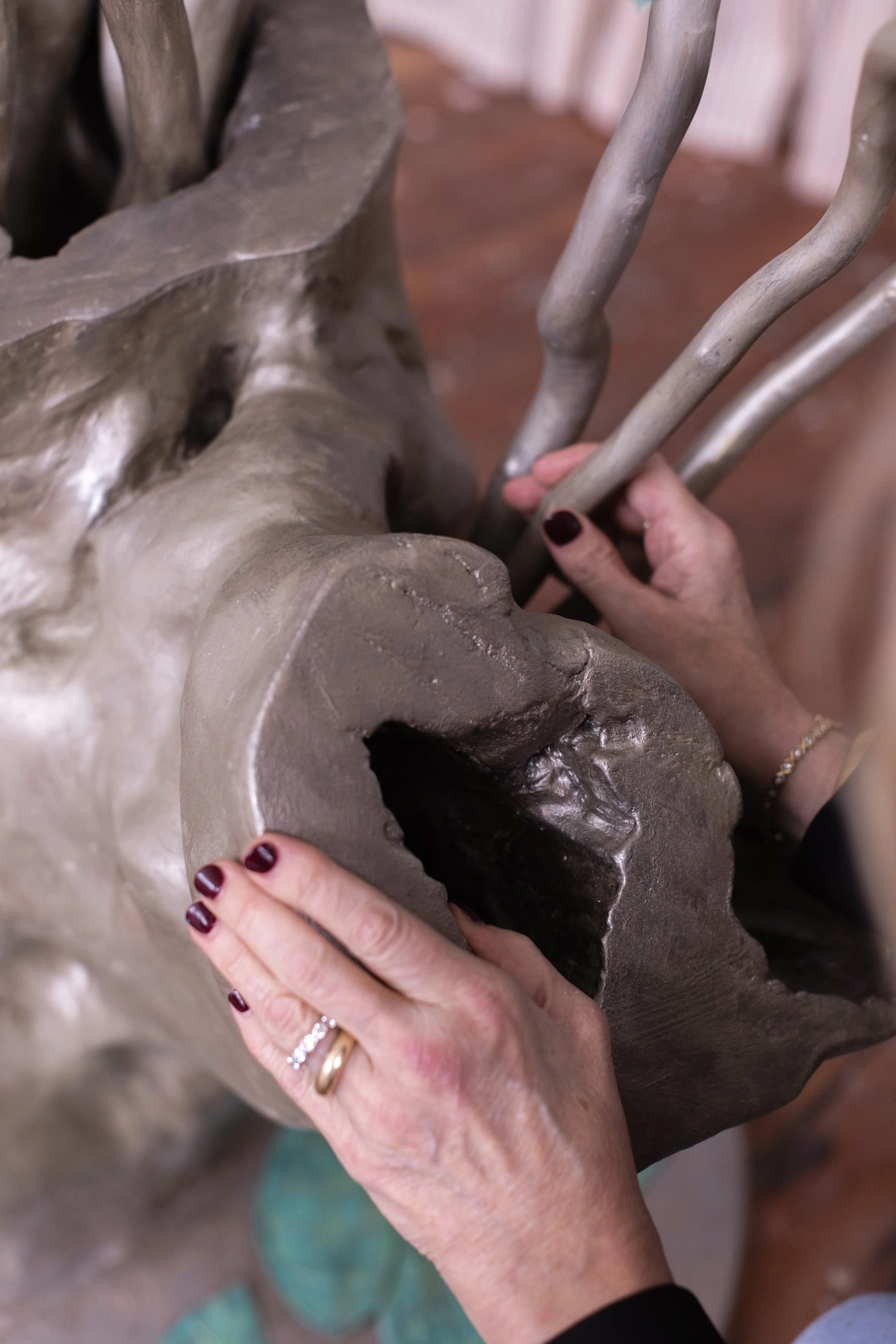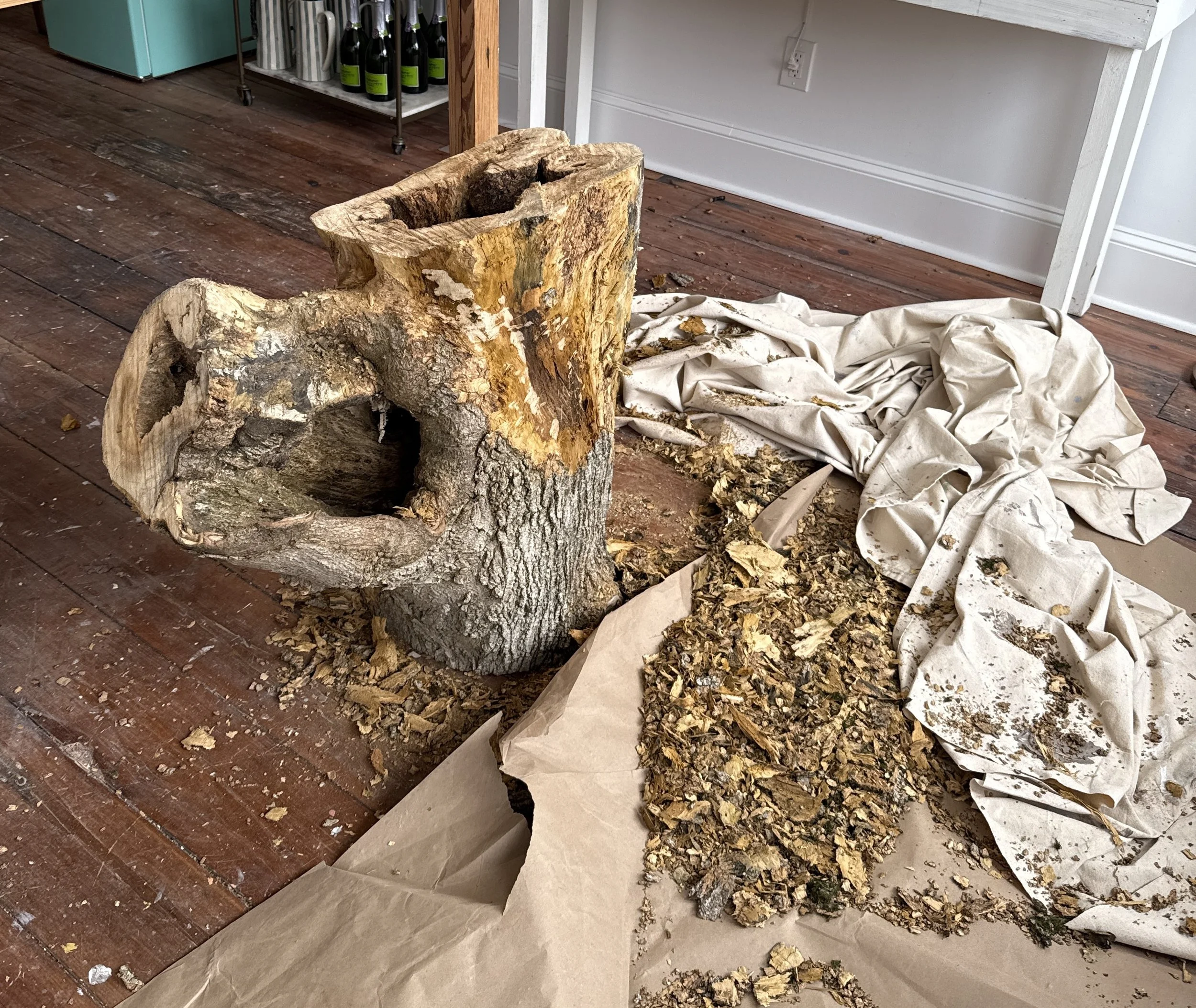 The vessel had to be a tree stump. I just knew this in my heart, but where was I going to find a tree stump, get it to my studio, and create a vessel? A big thank you to Ranna Moore of Mary Frances Maker for jokingly sending me a text of a dead boxwood elm in her backyard her landlord had cut down and was going to throw in the creek.