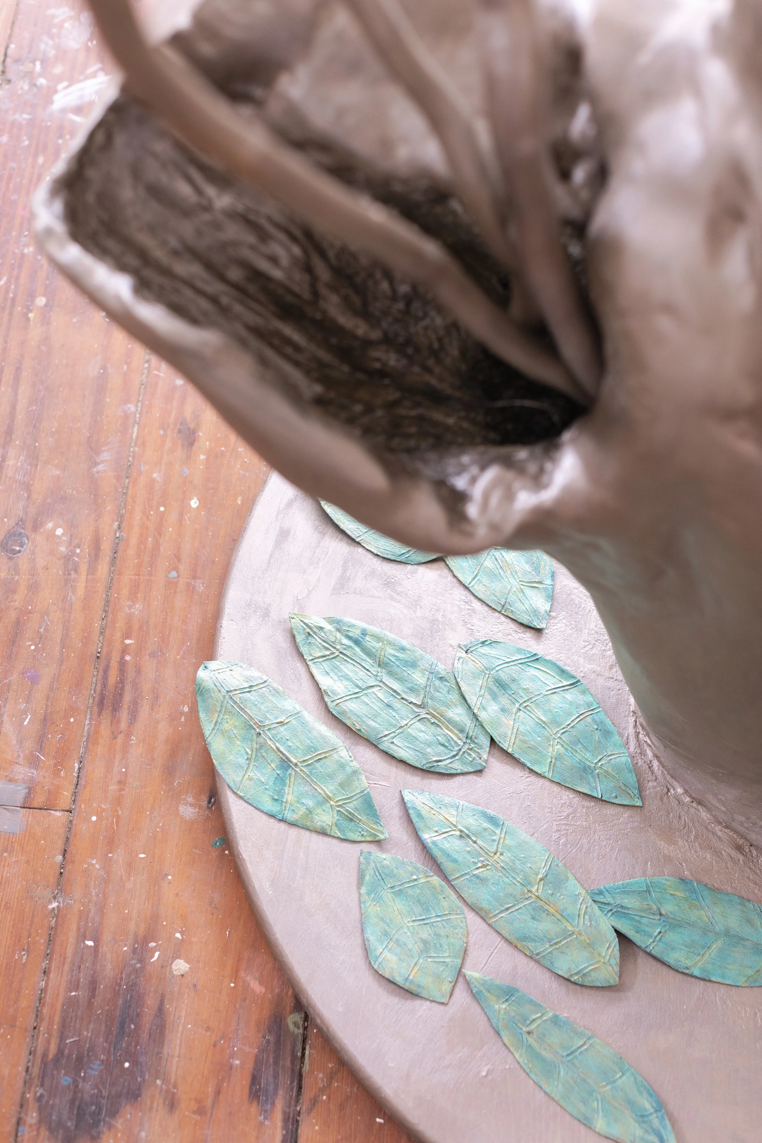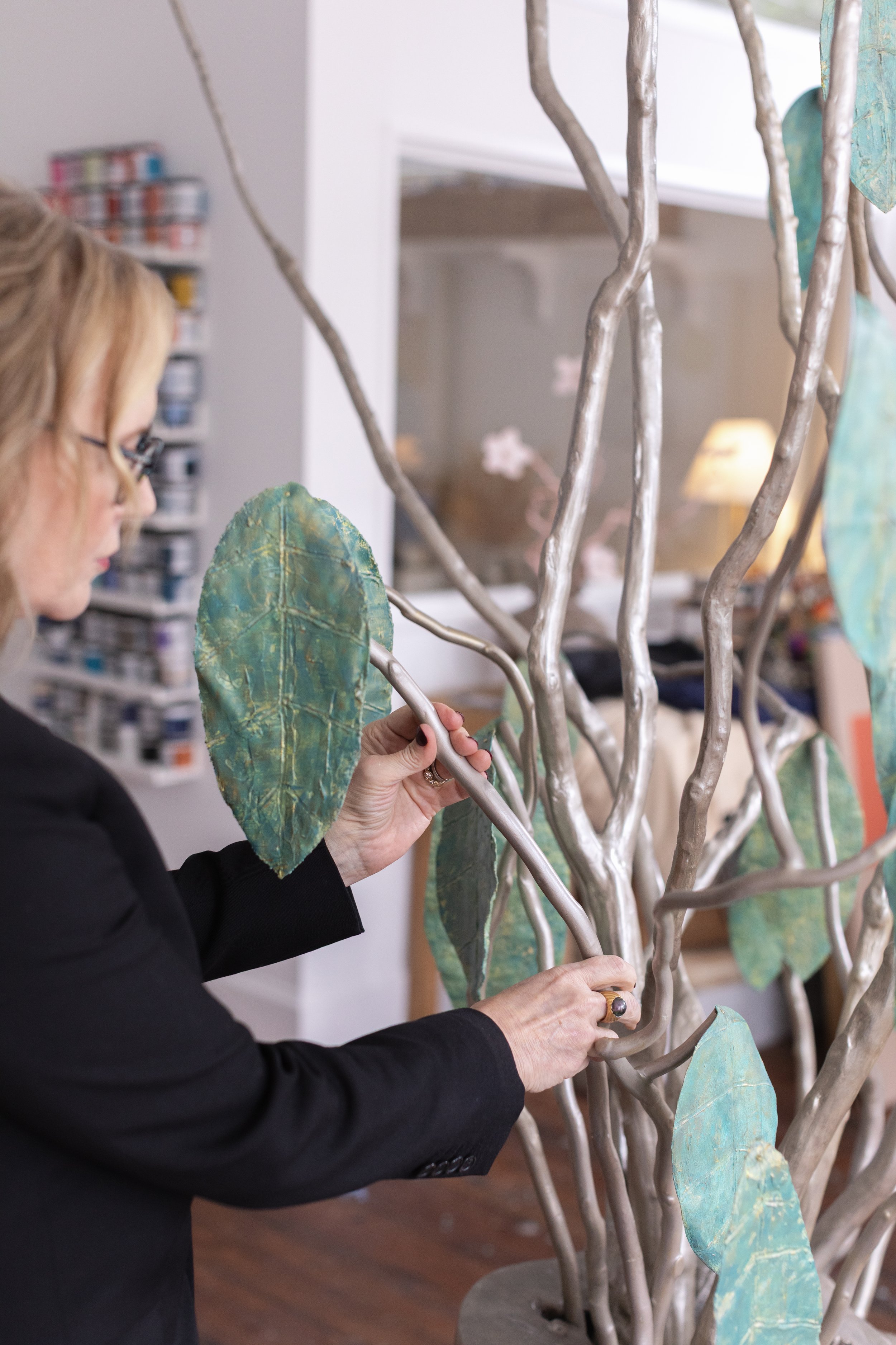 The Balance Team saw the brass leaves in my studio and asked if they could be the fallen leaves around the tree. The leaves as you may know were drawn as a doodle by Liza while she visited the studio (long before there was a tree). Mary Frances Maker had the leaves made in 3 sizes in copper and brass.